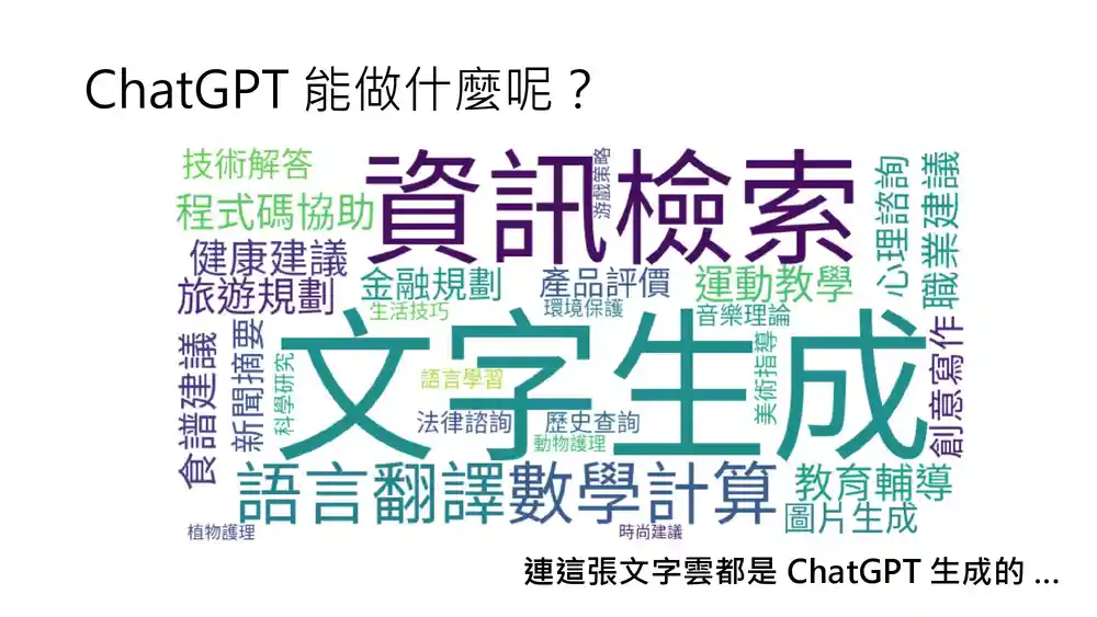 那么,ChatGPT究竟能做些什么呢?在一张文字云中展示了 ChatGPT 能够完成的各种任务。当然,它最基本的能力是文字生成。除此之外,它还可以提供技术解答、检查程序代码、协助提供健康建议、旅游建议、生活技巧等,它能够做的事情非常多。实际上,这张文字云也是通过ChatGPT生成的。